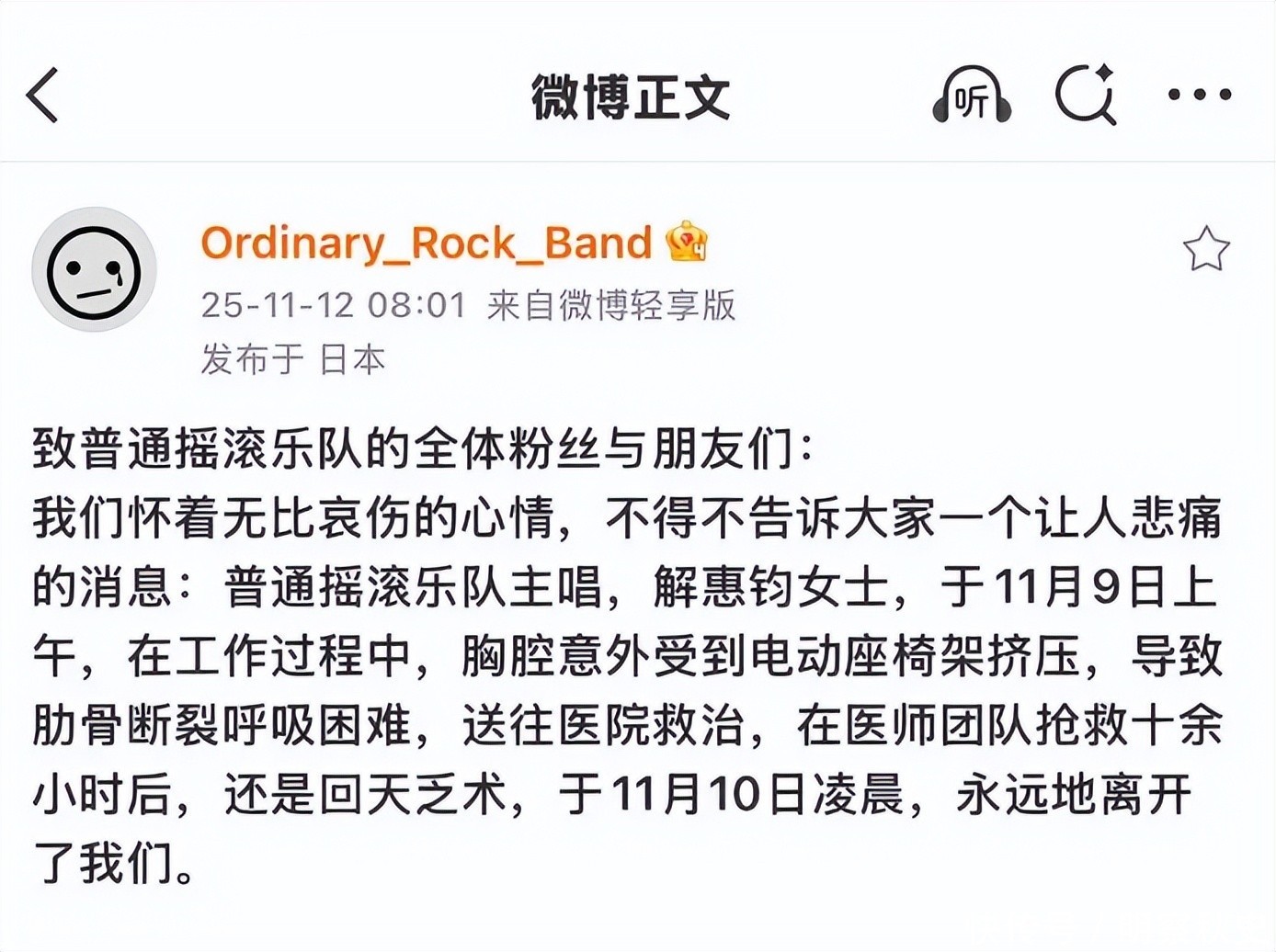 2025年11月12日,普通摇滚乐队的官方账号发布了一则消息: