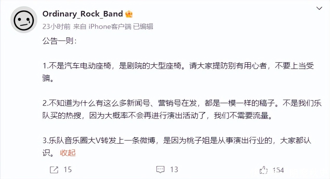 普通摇滚乐队在澄清电动座椅谣言的同时,也表示自己团队大概率不会再进行演出了。