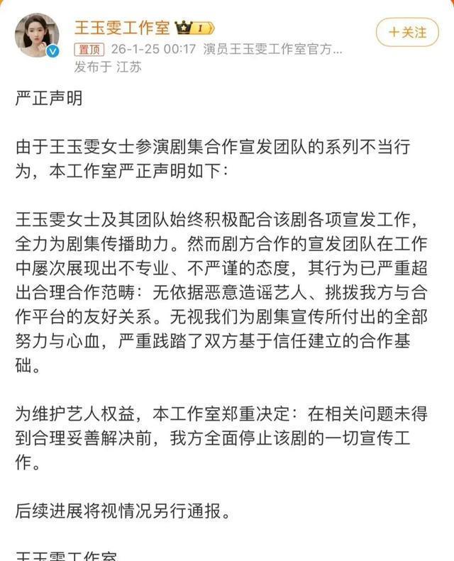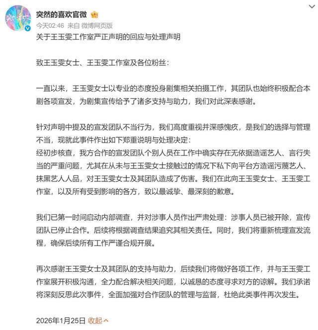 1月25日凌晨,一则决绝的声明打破了娱乐圈的平静。女星王玉雯工作室突然宣布,全面停止新剧《突然的喜欢》的一切宣传工作。这可是自己主演的剧,到底发生了什么,能让艺人方做出如此“自断臂膀”的决定?       深夜时分,当大多数人还在睡梦中,王玉雯工作室的声明却像一颗炸雷,在社交媒体上引爆。       声明内容言简意赅,却充满了愤怒和决绝:因剧方合作的宣发团队存在“无端恶意造谣”演员的行为,并挑拨演员与平台的关系,即刻起,全面停止配合该剧的一切宣传工作!       消息一出,网友都懵了。       一部剧的男女主角,是宣传的核心。临近播出,女主角的团队却公开宣布“罢工”,这在圈内是极为罕见的操作。这无异于在开战前,先自损八百。       很多人第一反应是,王玉雯团队是不是太冲动了?有什么事不能私下解决,非要闹到台面上?       毕竟,这部由陈星旭、王玉雯主演的都市剧,关注度并不低。女主角撂挑子不干了,对剧、对她自己,都不是好事。       随着网友的深扒和工作室后续的回应,这场风波背后的真相,让人脊背发凉。       原来,问题的根源出在了剧组合作的宣传团队身上。       这个本该为剧和演员服务的团队,在没有与王玉雯方进行任何接触的情况下,竟然向合作的播出平台恶意散布虚假信息,谎称王玉雯“自行策划并发布宣传物料”。       这句话的分量,圈外人可能不理解,但在业内,这几乎等于直接给演员打上了“不专业、难合作、耍大牌”的标签。它不仅破坏了演员和剧组的信任,更是在直接挑战播出平台的规则,试图离间演员和平台的关系。       本该是抬轿子的人,却干起了掀轿帘的勾当。       这种来自“自己人”的背刺,远比来自外部的攻击更伤人。面对这种触及职业底线的恶意中伤,王玉雯工作室选择了最直接、最刚硬的方式回击。       正如工作室在回复网友时说的:“剧方合作团队无端恶意造谣演员。”没有含糊其辞,直指要害。       王玉雯方的强硬态度,换来了剧组的“光速滑跪”。       眼看事态扩大,新剧宣传即将瘫痪,《突然的喜欢》官微连夜发布道歉声明。       声明中,剧组承认了宣传团队存在问题,并迅速做出了处理:涉事人员已被开除,与该宣传团队立即停止合作。同时承诺,将重新梳理宣发流程,确保后续工作严谨合规。       这场风波,从爆发到解决,不过短短几个小时。       出生于1997年的王玉雯,从北京舞蹈学院毕业后,凭借《少年派》、《你给我的喜欢》等作品被观众熟知。她在综艺中展现出的爽快、真诚的性格,也让她收获了不少粉丝。       这一次的正面硬刚,再次印证了她“人如其名”的行事风格。       在复杂的名利场里,真诚有时竟成了最需要被捍卫的品质。       这次事件,无疑是给整个行业的某些乱象敲响了警钟。演员与剧组本是命运共同体,一荣俱荣,一损俱损。当本该是战友的宣传方,为了某些不可告人的目的,将黑手伸向自己服务的艺人时,这样的团队,不要也罢。       对于王玉雯工作室这次“掀桌子”式的维权,你怎么看?       王玉雯工作室停止新剧宣传--潇湘晨报       《突然的喜欢》剧组致歉--现代快报       圈内爆料:女星王玉雯被合作方造谣--都市现场       免责声明:       本文内容根据网络公开信息整理,仅供参考,不代表作者或平台对其真实性、准确性或完整性作出任何承诺。涉及活动、聚会、时间地点等具体信息,请读者务必自行核实。任何基于本文内容作出的决策或行动,其风险由读者自行承担。作者及平台不对因使用本文内容而产生的任何后果负责。